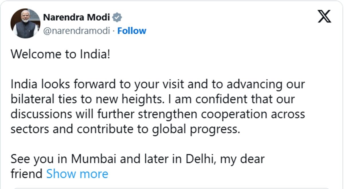 “भारत में आपका स्वागत है! भारत आपकी यात्रा और हमारे द्विपक्षीय संबंधों को नई ऊंचाइयों पर ले जाने के लिए उत्सुक है। मुझे विश्वास है कि हमारी चर्चाएं विभिन्न क्षेत्रों में सहयोग को और मजबूत करेंगी और वैश्विक प्रगति में योगदान देंगी।