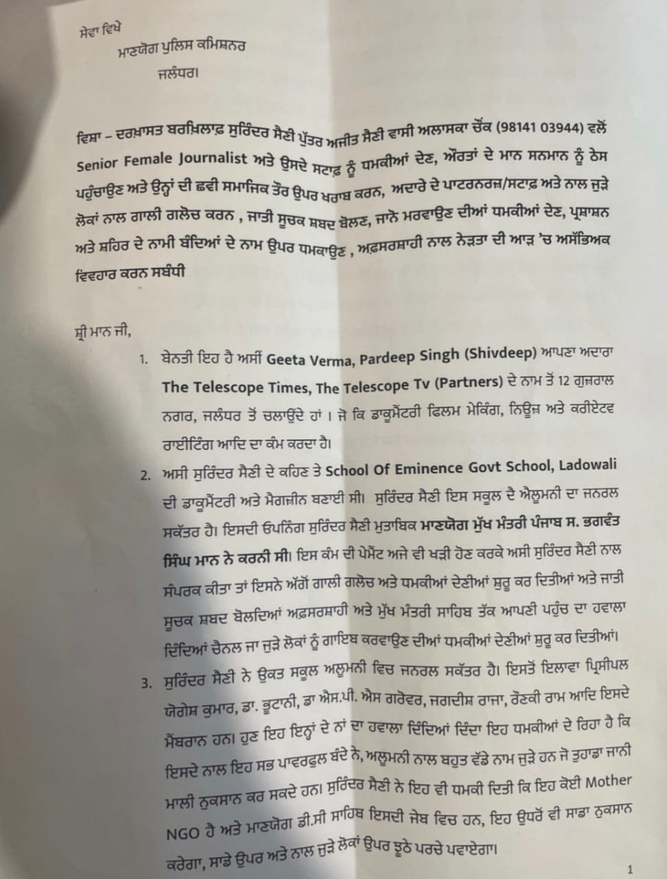 सीनियर महिला पत्रकार ने आरोप लगाया है कि सुरिंदर सैनी ने उन्हें जान से मारने की धमकी दी है और जातिसूचक शब्द भी बोला है। उन्होंने पुलिस कमिश्नर से मांग की है कि सुरिंदर सैनी पर तत्काल रूप से FIR दर्ज की जाए।