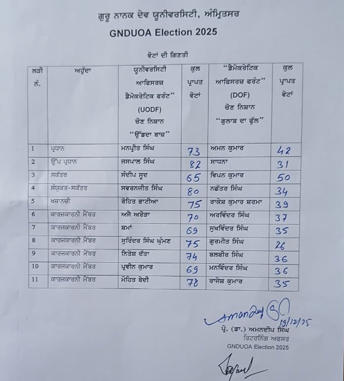 रिटर्निंग ऑफिसर प्रो. (डॉ.) अमनदीप सिंह द्वारा जारी नतीजों के अनुसार, “उड़ा बाज” सिंबल पर चुनाव लड़ रहे UODF पैनल ने “गुलाब फूल” सिंबल पर चुनाव लड़ रहे डेमोक्रेटिक ऑफिसर्स फ्रंट (DOF) को हर पोस्ट पर भारी अंतर से हराया।