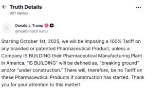 ट्रंप ने लिखा कि यह कदम उन दवा कंपनियों पर लागू होगा जो अमेरिका में निर्माण (मैन्युफैक्चरिंग) यूनिट नहीं बना रही हैं। यह फैसला ऐसे समय में आया है जब अमेरिकी अर्थव्यवस्था पहले से ही मुद्रास्फीति, ऊंची ब्याज दरों और घटती उपभोक्ता मांग से जूझ रही है।