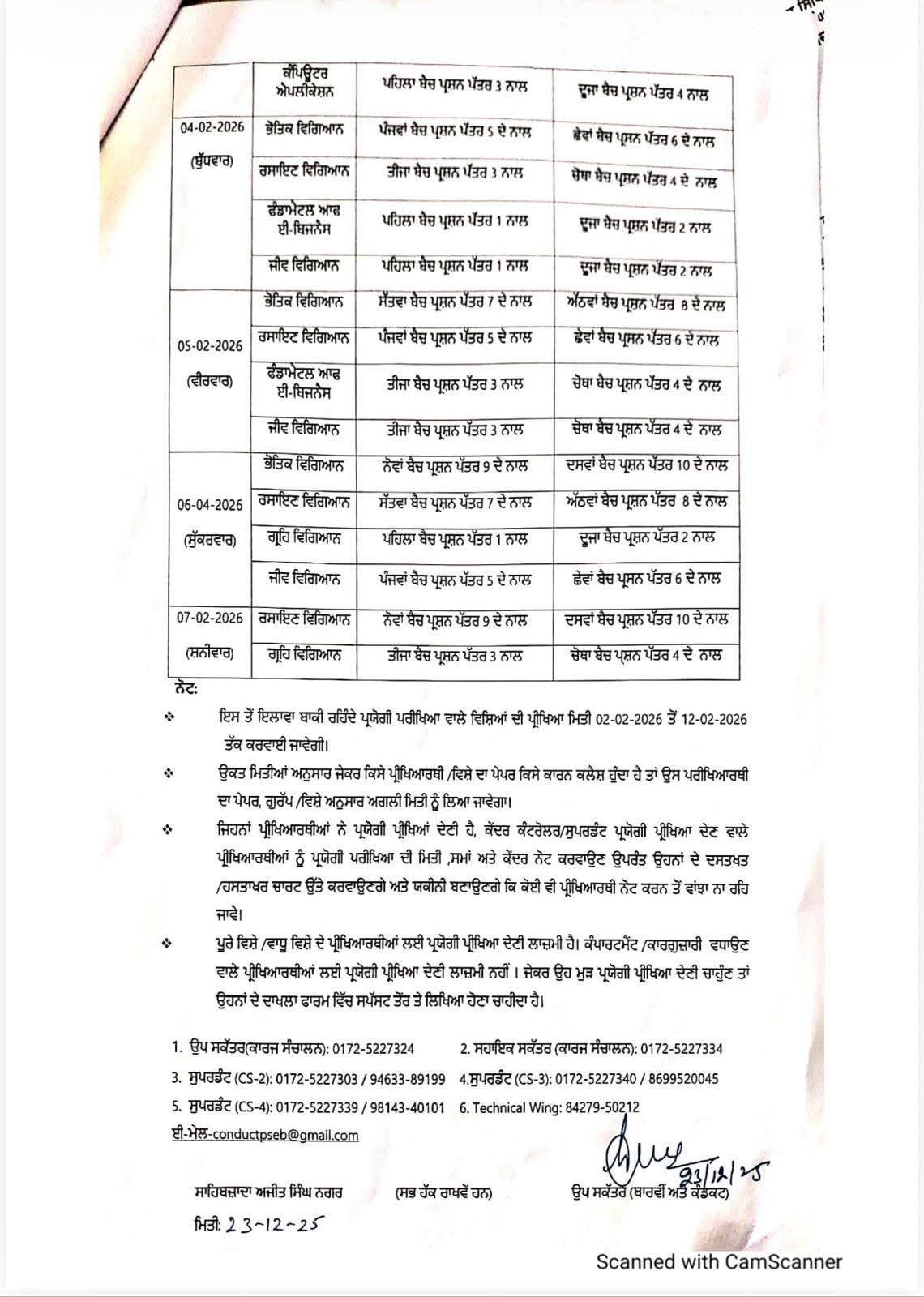 चंडीगढ़ः पंजाब स्कूल शिक्षा बोर्ड ने 10वीं-12वीं के बोर्ड क्लास की प्रैक्टिकल एग्जाम की डेटशीट जारी कर दी है। प्रैक्टिकल एग्जाम 2 फरवरी से लेकर 12 फरवरी 2026 के बीच होंगे। बोर्ड ने डेटशीट अपनी ऑफिशियल वेबसाइट www.pseb.ac.in पर अपलोड कर दी है।